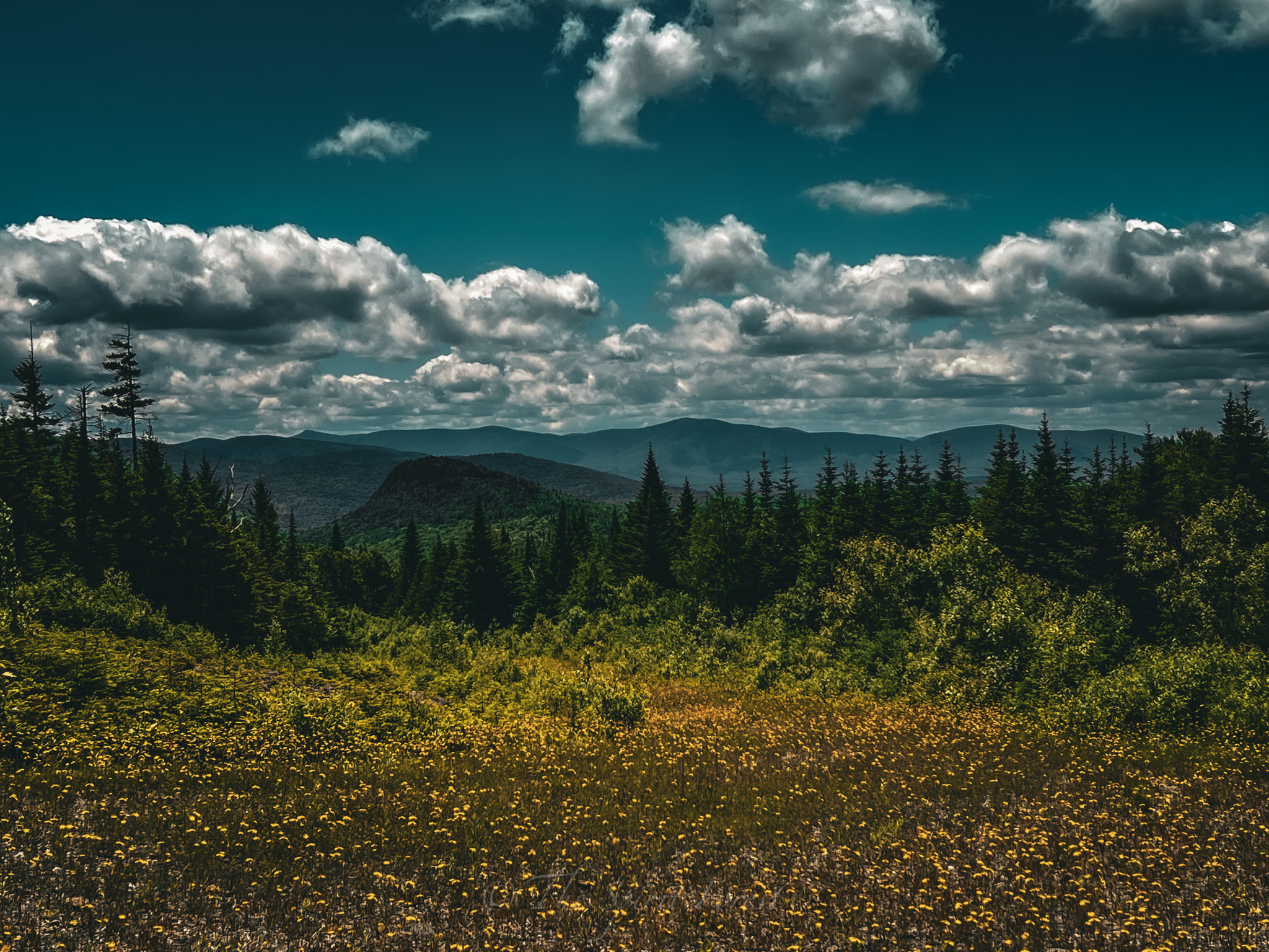 I continued down to Sugar Hill Trail where I came out onto a quick road section to Alison Falls. I snapped a few photos, loaded up on water and hiked up to the summit of Mud Pond Ridge. Once I was down the small mountain, I came out to a clearing with a closed atv road full of wildflowers and a spectacular view of the mountains past Dixville Notch.