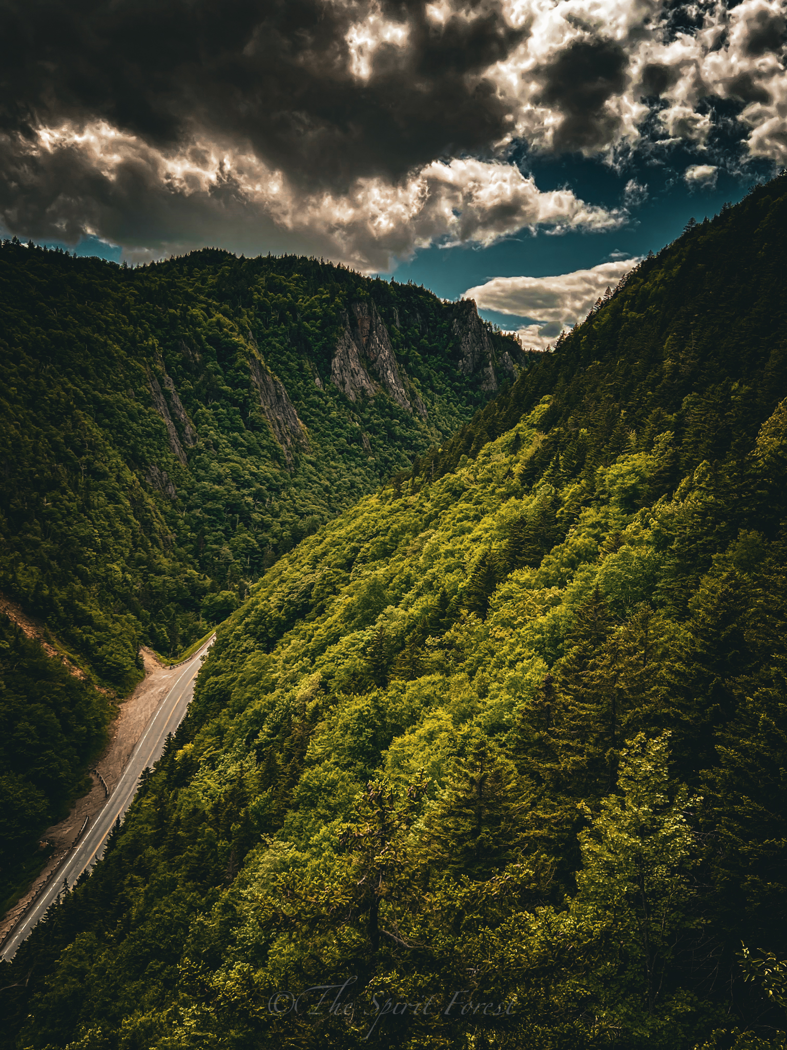 With my feet still sore, I kept going. I was going as fast as my tender feetsies would allow. I finally came to a small outcropping on my right and saw the towering cliffs on the other side of the Notch. Amazing. I’d never seen it from this perspective before. It was so beautiful. Of course I pulled out the camera, but kept a safe distance from the sheer drop offs in front of me. It was windy up there. After the amazement subsided, I continued on to the other outcroppings to once again admire the views from high above the winding road below.