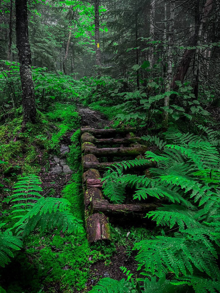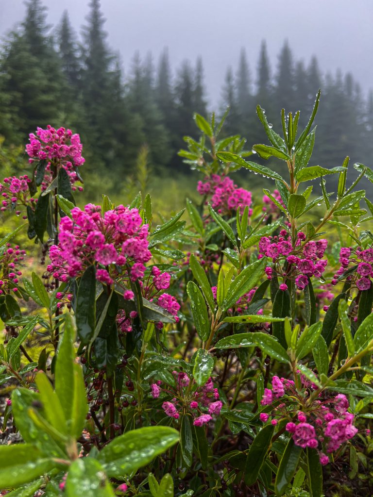 Once I had climbed out of the notch, I came out onto Bulldozer Flat. It supposedly had really nice views to the west, but the fog socked me in. It was still beautiful in it’s own way. It was full of neon green grass, and bright pink sheep laurels. The balsam fir trees were faded into the mist and it just seemed so magical.